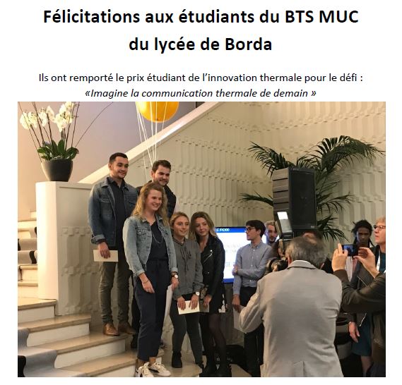 Félicitations aux étudiants du BTS MUC du lycée de Borda Ils ont remporté le prix étudiant de l’innovation thermale pour le défi : «Imagine la communication thermale de demain »