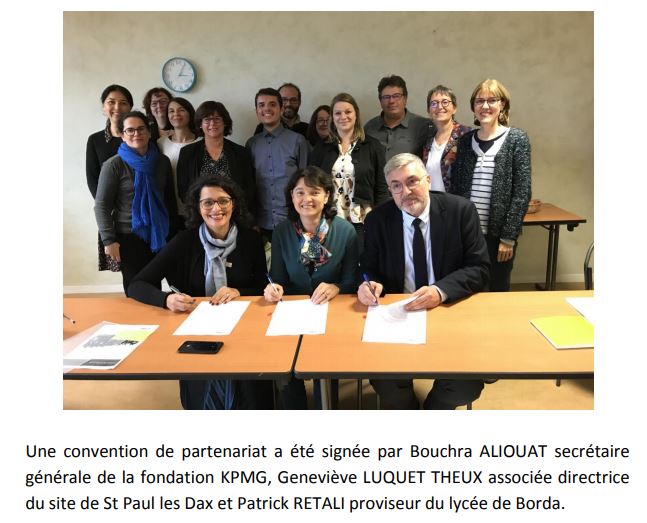 Une convention de partenariat a été signée par Bouchra ALIOUAT secrétaire générale de la fondation KPMG, Geneviève LUQUET THEUX associée directrice du site de St Paul les Dax et Patrick RETALI proviseur du lycée de Borda. |