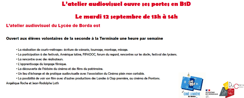 · Quelques repères : La réalisation de courts-métrages : écriture de scénario, tournage, montage, mixage. · La participation à des festivals, Amérique latine, FIPA, forum du regard, rencontres sur les docks, festival des lycéens. · La rencontre avec des réalisateurs. · L’apprentissage du langage filmique. · La découverte de l’histoire du cinéma et des films du patrimoine. · Un lieu d’échange et de pratique audiovisuelle avec l’association du Cinéma plein mon cartable. · La possibilité de voir son film avec d’autres productions des Landes à Clap première, au cinéma de Pontonx. Deux films ont été faits par l’atelier durant l’année 2020 et celui sur l’océan a été monté en période de confinement |
