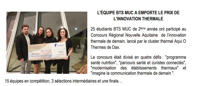 Félicitations aux étudiants du BTS MUC du lycée de Borda Ils ont remporté le prix étudiant de l’innovation thermale pour le défi : «Imagine la communication thermale de demain »