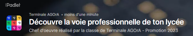 Retrouvez les nouveautés concernant cette formation : et des expériences ou réalisations d' élèves : Pendant toute une année, la classe de Terminale AGOrA s'est collectivement investie dans le cadre de la réalisation de son Chef d'Oeuvre pour proposer un Padlet de ressources numériques interactives et ludiques afin de faire découvrir et promouvoir la Section Professionnelle du Lycée et toutes les filières pros présentes à Borda. rendez-vous en juin pour les résultats ! |