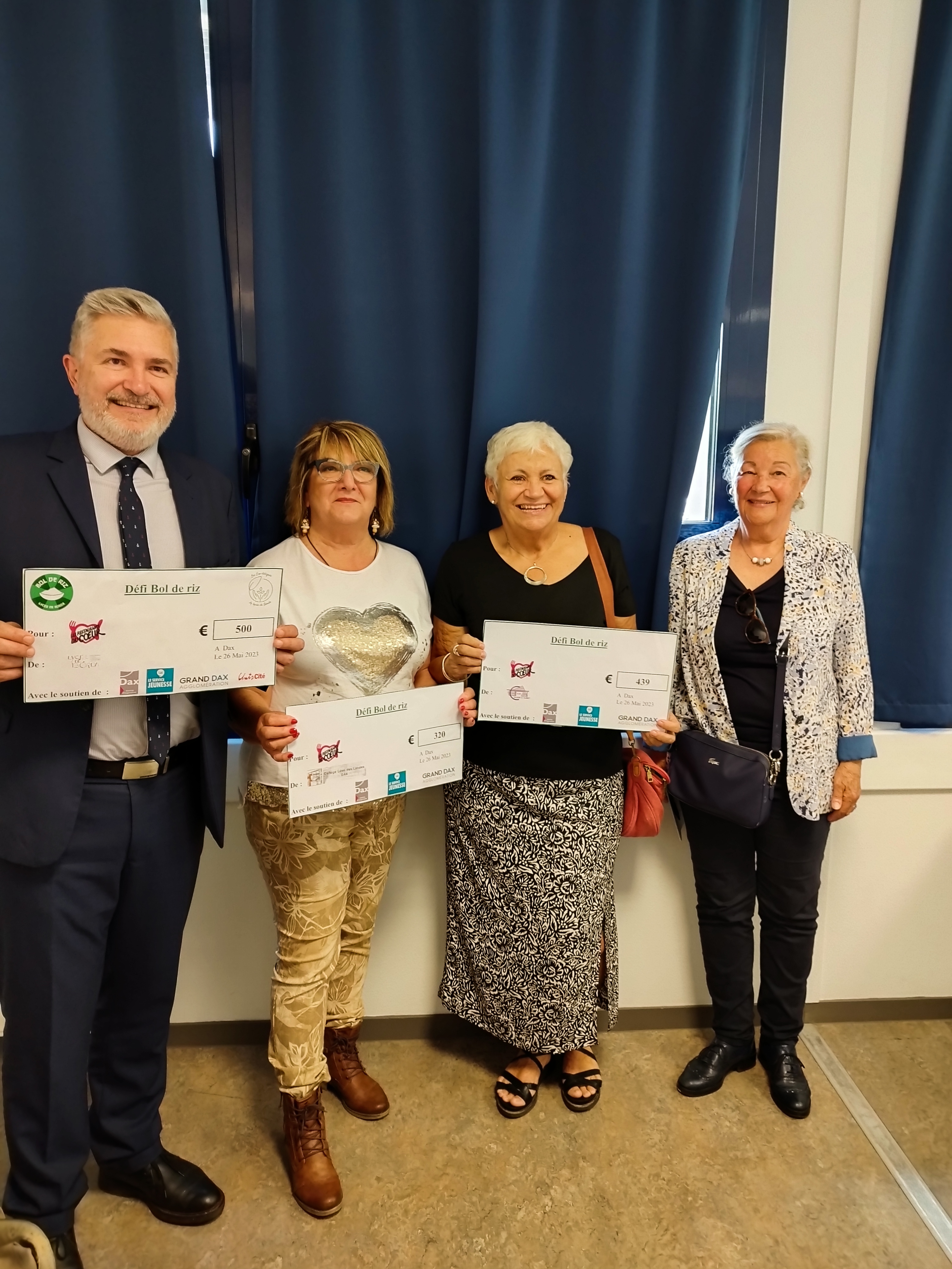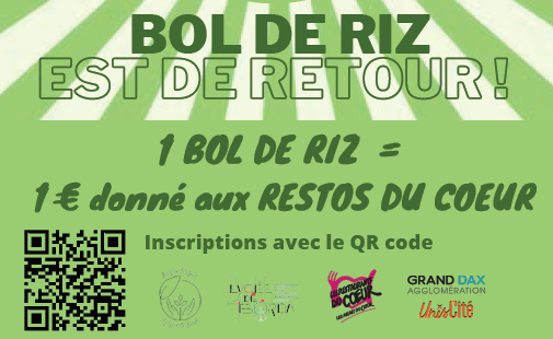 Défi bol de riz de retour au lycée : cliquez sur les images pour plus d' infos L'affiche Le diaporama et ..... Vendredi 26 Mai, les éco-délégués du lycée ont remis le don, issu du "défi Bol de riz", aux responsables des Restos du Cœur des centres de Dax et de Saint-Paul-lès-Dax. Madame Destandau, conseillère municipale de Dax, et Monsieur Retali ont participé à cette cérémonie. Le défi "Bol de riz" ayant également eu lieu cette année au collège Léon des Landes et au collège Albret, plus de 1000 euros ont été collectés. Bravo et merci à toutes et à tous pour votre participation !